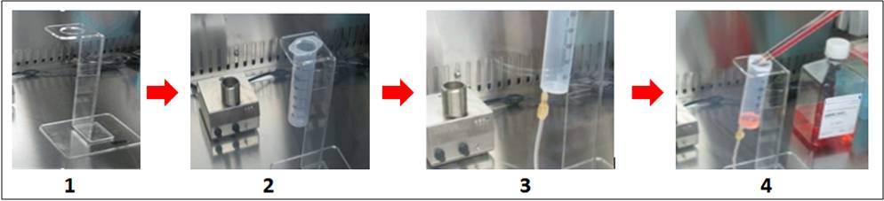1.將細(xì)胞培養(yǎng)袋支架立于操作臺上,確保臺面無尖銳物品。 2.取50m注射器一個,拔出推塞,將注射器套筒插入培養(yǎng)袋支架上的圓孔內(nèi)。 3.將培養(yǎng)袋A端螺口旋下,與注射器套筒連接。 4.加入待培養(yǎng)細(xì)胞及培養(yǎng)液。具體步驟如下圖所示:
