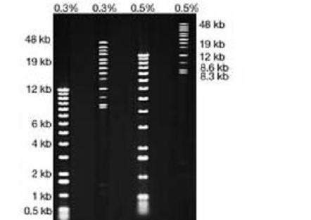 品名:SeaKem Gold Agarose 品牌:Lonza 貨號:50150 SeaKem Gold Agarose瓊脂糖的產品應用: • 脈沖場凝膠電泳(PFGE)實驗Pulsed field gel electrophoresis-PFGE • 長片段DNA的分離Large fragment separation • 巨大堿基DNA即長片段和超長片段DNA印跡實驗Blotting of megabase DNA • 高效分離分子量大于600kDa的蛋白Effective for separating proteins >600kDa 簡介: SeaKem Gold瓊脂糖是一種高凝膠強度,低EEO,標準膠凝溫度的瓊脂糖。這種遺傳學術級別(Genetic Technology Grade,GTG)瓊脂糖最適于脈沖場凝膠電泳法(pulsed field gel electrophoresis,PFGE)快速分辨Mb(megabase)(50kb-10Mb)DNA和常規電泳方法分辨1-50kb的DNA與PCR產物。因其低EEO特性,SeaKem Gold瓊脂糖中的DNA電泳遷移速度要顯著的高于常規瓊脂糖凝膠。PFGE的跑膠時間依使用的緩沖液和瓊脂糖濃度的不同可減少至原電泳時間的50%。因其高凝膠強度,即使是使用低濃度(0.5%)的SeaKem Gold瓊脂糖凝膠,操作處理依然很方便,從而允許在常規電泳中分離更大的DNA片斷并減少PFGE中的DNA分離的耗時。 應用: 脈沖場凝膠電泳; 標準凝膠電泳分離大于23kb的DNA片斷; Mb大小DNA印跡。 分析說明: 膠凝溫度(1.5%):34.5℃-37.5℃ 硫酸鹽:≤0.10% 凝膠強度(1.0%:≥1800g/cm2 凝膠強度(1.5%):≥3500g/cm2 濕度:≤10% EEO(-Mr):≤0.05 訂購信息 :