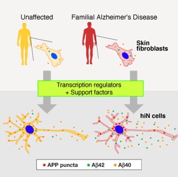 Directed Conversion of Alzheimer's Disease Patient Skin Fibroblasts into Functional Neurons Liang Qiang, Ryousuke Fujita, Toru Yamashita, Sergio Angulo, Herve Rhinn, David Rhee, Claudia Doege, Lily Chau, Laetitia Aubry, William B. Vanti, Herman Moreno, Asa Abeliovich Directed conversion of mature human cells, as from fibroblasts to neurons, is of potential clinical utility for neurological disease modeling as well as cell therapeutics. Here, we describe the efficient generation of human-induced neuronal (hiN) cells from adult skin fibroblasts of unaffected individuals and Alzheimer's patients, using virally transduced transcription regulators and extrinsic support factors. hiN cells from unaffected individuals display morphological, electrophysiological, and gene expression profiles that typify glutamatergic forebrain neurons and are competent to integrate functionally into the rodent CNS. hiN cells from familial Alzheimer disease (FAD) patients with presenilin-1 or -2 mutations exhibit altered processing and localization of amyloid precursor protein (APP) and increased production of Aβ, relative to the source patient fibroblasts or hiN cells from unaffected individuals. Together, our findings demonstrate directed conversion of human fibroblasts to a neuronal phenotype and reveal cell type-selective pathology in hiN cells derived from FAD patients. |
