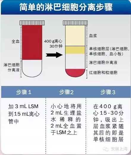 人外周血中各種細胞的密度不同,人紅細胞密度為1.093g/mL,粒細胞為1.092g/mL,淋巴細胞為1.074±0.001g/mL。密度梯度離心法的原理主要根據各類血細胞比重的差異,使一定比重的血細胞依相應的密度梯度分布于不同的獨立帶,從而達到分離的目的。 在離心管中,將經過生理鹽水稀釋過的全血加在LSM淋巴細胞分離液之上,經過30min,400g的離心后將會出現四個分層,分別為血漿層、單核細胞層(淋巴細胞、單核細胞、血小板)、淋巴細胞分離液層、紅細胞和粒細胞層。如下圖所示: 1. 直接使用,無需配置,一步分離。 2. 單個核細胞得率高,2ml的血能分出2E7單核細胞。 3. 低內毒素含量 <0.064 EU/mL。 4. 分離條帶清晰,紅細胞不破損。 5. 分離后細胞純度>97%,活性>98%。