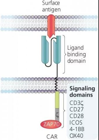 圖1. 嵌合抗原受體(CAR)的結構 摘選自CAR-T細胞制備的掛圖,通過Nature Protocols制作并由STEMCELL Technologies提供支持。以下研究表明可以通過特異性靶點的選擇,來減少CAR-T細胞療法副作用: