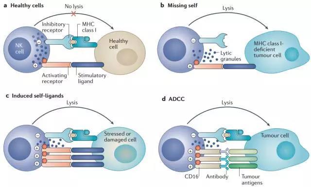 NK細胞又稱自然殺傷細胞(natural killer cell,NK細胞),是機體內重要的免疫細胞,NK細胞形態上屬于大顆粒淋巴細胞,來源于骨髓,是除T細胞、B細胞之外的第三大類淋巴細胞,約占血液中所有免疫細胞(白細胞數量)的15%,屬于天然免疫系統的核心細胞,主要分布于外周血、肝臟和脾臟,在人體內NK細胞主要特征為CD3-CD56+淋巴細胞群,其中血液中主要為CD16+CD56dim亞型(根據細胞上CD56分子表達密度的差異,將NK細胞分為CD56dim和CD56bright兩個亞群;CD56dim占NK細胞90%以上,主要為細胞毒作用,表達中度親和力的IL-2受體(IL-2R),具有更強的殺傷活性;CD56bright可產生大量細胞因子,主要起免疫調節作用,高表達IL-2R)。 NK細胞是體內負責殺傷老化、受病毒感染、腫瘤等異常細胞的最主要“戰士”。NK細胞與人體其他150多種白細胞都不同,它不需要接受免疫系統的特殊指令,也不需要其他細胞的配合,自己單獨就能識別和攻擊外來細胞、癌細胞和病毒。循環的NK細胞通常處于休眠狀態,一旦被激活,它們會滲透到組織中,分泌穿孔素及腫瘤壞死因子,攻擊腫瘤細胞和病毒感染細胞 NK細胞是人體抵抗癌細胞和病毒感染的第一道防線,可非特異性直接殺傷腫瘤細胞,這種天然殺傷活性既不需要抗原致敏,也不需要抗體參與,且無MHC限制。除了具有強大的殺傷功能外,還具有很強的免疫調節功能,與機體其他多種免疫細胞相互作用,調節機體的免疫狀態和免疫功能。臨床研究發現NK細胞過繼免疫治療惡性腫瘤具有良好的應用前景,對多種實體瘤和血液系統惡性腫瘤均有一定效果。 相關詞匯: 過繼免疫療法(adoptive immunotherapy)是取對腫瘤有免疫力的供者淋巴細胞轉輸給腫瘤者,或取患者自身的免疫細胞在體外活化、增殖后,再轉輸入患者體內,使其在患者體內發揮腫瘤作用。 T細胞受體(TCR)在識別APC細胞或者靶細胞上的MHC分子所提呈的抗原肽時,不僅識別抗原肽,還要識別與抗原肽結合的MHC分子類型,此現象即MHC限制性(MHC restriction)。 注:APC細胞是抗原提呈細胞指T細胞在識別Ag遞呈細胞傳遞的抗原信息時,必須先識別遞呈細胞上的MHC抗原類型,如TH細胞識別MHC-Ⅱ類抗原,而TC細胞只識別MHC-Ⅰ類抗原,之后才獲取抗原信息的現象。 NK細胞識別自我與非我并不需要體細胞基因重排產生識別不同抗原的克隆,而是表達多種受體執行功能。 NK細胞受體主要包括免疫球蛋白超家族(如KIR),C型凝集素家族如NKG2受體,天然細胞毒性受體(NCR):NKp46、NKp44和NKp30,下表例舉主要的受體及其調節功能: NK可釋放穿孔素、顆粒酶,穿孔素在靶細胞表面穿孔,使顆粒酶b進入靶細胞誘導靶細胞凋亡。同時分泌大量的細胞因子,如ifn-v、tnf-x、gm-csf、il-3、m-csf等,直接作用于靶細胞,或通過進一步激活其他種類免疫細胞攻擊靶細胞。并可表達可以誘導細胞凋亡的蛋白(fasl)和腫瘤壞死因子相關凋亡誘導配體(trail),使靶細胞進入程序性凋亡狀態。 NK細胞治療流程 NK細胞的“動態平衡”狀態受細胞表面多種受體蛋白的調控,簡言之,分為2類:殺傷細胞活化受體(KAR)和殺傷細胞抑制受體(KIR)。 圖a. 正常情況下,KAR與自身細胞上多糖類抗原結合產生活化信號,同時KIR與MHC I類分子結合,產生抑制信號且占主導地位,以保證自身組織細胞不被破壞,阻止NK對自身健康細胞的殺傷。 圖b. 當細胞表面MHC I類分子發生改變或減少缺失(腫瘤細胞或其他損傷的細胞為逃逸獲得性免疫追殺而下調MHC消除抑制信號),影響與KIR結合,不能產生抑制性信號,NK則活化,釋放溶解性顆粒產生殺傷效應(MHC I丟失自我) 。 圖c. 即使存在抑制信號,腫瘤細胞亦可通過過表達表面抗原與KAR結合,腫瘤細胞可以通過激活NK細胞受體來表達被誘導的應激配體,此時活化信號超過抑制信號,繼而激活NK細胞殺傷靶細胞。 圖d. NK細胞還表達IgG1和IgG3的低親和力受體FcγRIII(CD16),可與腫瘤抗原特異性抗體Fc段結合,介導NK細胞識別并殺傷被抗體包被的腫瘤細胞,亦稱為抗體依賴性細胞介導的細胞毒作用(antibody dependentcell-mediated cytotoxicity, ADCC),ADCC也是NK細胞殺傷靶細胞的主要方式。 目前認為NK細胞主要通過以下途徑發揮殺傷作用: 1.NK細胞直接通過胞吐作用釋放穿孔素和顆粒酶等細胞毒性顆粒,活化半胱天冬酶(caspase)途徑誘導靶細胞凋亡; 2.活化NK細胞表達Fas(CD95)配體和TRAIL(TNF related apoptosis inducing ligand,腫瘤壞死因子相關誘導凋亡配體)分子,誘導CD95+靶細胞和TRAIL受體陽性的靶細胞通過內源酶的級聯反應發生凋亡; 3.細胞因子介導的殺傷作用,NK細胞能合成和分泌多種細胞因子,如IFNγ、TNFα、IL1、IL5、IL8、IL10和GCSF; 4. ADCC作用。 鑒于NK細胞自身的作用機制,在腫瘤免疫治療中,主要通過以下策略來促使NK細胞發揮最大的作用: 1,免疫檢查點抑制劑,解除NK細胞的抑制信號; 2,使用NK細胞進行癌癥治療; 3,嵌合抗原受體(CAR)技術與NK細胞結合; 4,雙特異性分子聯結NK細胞活化受體和腫瘤細胞。 圖a. 某些激活的NK細胞表達PD1和CTLA4。研究者在多發性骨髓瘤患者體內檢測到其NK細胞表達PD1,應用PD1單抗(CT-011)后能修復NK細胞介導的抗腫瘤效應;此外,應用PDL1的IgG1單抗還可能激發NK細胞的ADCC。NK細胞表面KIR類的抑制性受體(KIR2DL1, KIR2DL2 和KIR2DL3)可與MHC I類分子結合,抑制NK細胞活化,體外實驗表明,應用IPH2102單抗阻斷KIR2DL1-3,可以增加NK細胞的抗腫瘤活性(作用機制圖a所示)。在AML和MM的臨床I-II期研究已證實anti-KIR的安全性,雖然目前anti-KIR單獨應用沒