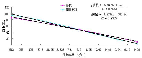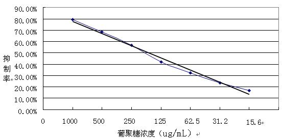 標準葡聚糖抑制濃度按1024ug/ml倍比稀釋,用已經建立的ELISA方法做間接競爭抑制ELISA檢測,實驗結果表明,當葡聚糖濃度大于512ug/ml時,反應完全被抑制;當葡聚糖濃度小于0.06ug/ml時,反應幾乎不被抑制。