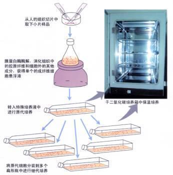 原代培養(yǎng):即第一次培養(yǎng),是指將培養(yǎng)物放置在體外生長環(huán)境中持續(xù)培養(yǎng),中途不分割培養(yǎng)物的培養(yǎng)過程。有幾方面含義: 1、培養(yǎng)物一經(jīng)接種到培養(yǎng)器皿(瓶)中就不在分割,任其生長繁殖; 2、原代培養(yǎng)中的“代”并非細(xì)胞的“代”數(shù),因?yàn)榕囵B(yǎng)過程中細(xì)胞經(jīng)多次分裂已經(jīng)產(chǎn)生多代子細(xì)胞; 3、原代培養(yǎng)過程中不分割培養(yǎng)物不等于不更換培養(yǎng)液,也不等于不更換培養(yǎng)器皿。 正常細(xì)胞培養(yǎng)的世代數(shù)有限,只有癌細(xì)胞和發(fā)生轉(zhuǎn)化的細(xì)胞才能無限生長下去。所謂轉(zhuǎn)化即是指正常細(xì)胞在某種因子的作用下發(fā)生突變而具有癌性的細(xì)胞。目前世界上許多實(shí)驗(yàn)室所廣泛傳用的HeLa細(xì)胞系就是1951年從一位名叫Henrietta Lacks的婦女身上取下的宮頸癌細(xì)胞培養(yǎng)而成。此細(xì)胞系一直延用至今。 原代培養(yǎng)是建立各種細(xì)胞系(株)必經(jīng)的階段,其是否成功與組織污染與否、供體年齡、培養(yǎng)技術(shù)和方法、適宜培養(yǎng)基的選擇等多種因素有關(guān)。由于原代培養(yǎng)的細(xì)胞轉(zhuǎn)化性極小,對(duì)病毒敏感性好,因此適應(yīng)制備疫苗等生物制品;但也存在有潛在外源因子、不能事先檢查標(biāo)本、且受供體年齡健康狀況的影響而導(dǎo)致批間差異大等缺陷。目前常用的原代細(xì)胞培養(yǎng)有雞胚成纖維細(xì)胞及豬腎、猴腎、地鼠腎等原代細(xì)胞。 原代培養(yǎng)的基本過程包括取材、培養(yǎng)材料的制備、接種、加培養(yǎng)液、置培養(yǎng)條件下培養(yǎng)等步驟,在所有的操作過程中,都必須保持培養(yǎng)物及生長環(huán)境的無菌。 多數(shù)情況下,分散的細(xì)胞若屬于貼壁依賴型細(xì)胞,就能黏附、鋪展于培養(yǎng)器皿和載體表面生長而形成細(xì)胞單層,這種培養(yǎng)方式稱為單層細(xì)胞培養(yǎng)(monolayer culture),又叫貼壁培養(yǎng)(adherent culture)。少數(shù)情況下,培養(yǎng)的細(xì)胞沒有貼壁依賴性,可通過專門設(shè)備使細(xì)胞始終處于懸狀態(tài)而在體外生長,這種形式稱為懸浮培養(yǎng)(suspension culture)。如何讓接種的細(xì)胞盡快貼壁,是決定培養(yǎng)成功的關(guān)鍵步驟: 1、取決于適當(dāng)?shù)纳L基質(zhì)表面; 2、可降低接種后培養(yǎng)液對(duì)細(xì)胞的浮力,如先少補(bǔ)加少量培養(yǎng)液,待細(xì)胞貼壁后再補(bǔ)足營養(yǎng)液繼續(xù)培養(yǎng); 3、注意適當(dāng)?shù)募?xì)胞接種密度,一般105個(gè)/ml左右。 傳代培養(yǎng):當(dāng)原代培養(yǎng)成功以后,隨著培養(yǎng)時(shí)間的延長和細(xì)胞不斷分裂,一則細(xì)胞之間相互接觸而發(fā)生接觸性抑制,生長速度減慢甚至停止;另一方面也會(huì)因營養(yǎng)物不足和代謝物積累而不利于生長或發(fā)生中毒。此時(shí)就需要將培養(yǎng)物分割成小的部分,重新接種到另外的培養(yǎng)器皿(瓶)內(nèi),再進(jìn)行培養(yǎng)。這個(gè)過程就稱為傳代(passage)或者再培養(yǎng)(subculture)。對(duì)單層培養(yǎng)而言,80%匯合或剛匯合的細(xì)胞是較理想的傳代階段。 體外培養(yǎng)技術(shù)中所謂的傳“代”概念并不等于細(xì)胞生物學(xué)中“親代細(xì)胞”與“子代細(xì)胞”中“代”的概念。傳代培養(yǎng)的實(shí)質(zhì)就是分割后再一次培養(yǎng),可以相對(duì)地衡量培養(yǎng)物的培養(yǎng)年齡。 5 培養(yǎng)實(shí)驗(yàn) 實(shí)驗(yàn)原理 傳代培養(yǎng)是組織培養(yǎng)常規(guī)保種方法之一。也是幾乎所有細(xì)胞生物學(xué)實(shí)驗(yàn)的基礎(chǔ)。當(dāng)細(xì)胞在培養(yǎng)瓶中長滿后就需要將其稀釋分種成多瓶,細(xì)胞才能繼續(xù)生長。這一過程就叫傳代。傳代培養(yǎng)可獲得大量細(xì)胞供實(shí)驗(yàn)所需。傳代要在嚴(yán)格的無菌條件下進(jìn)行,每一步都需要認(rèn)真仔細(xì)的無菌操作。 實(shí)驗(yàn)材料和器材 材料:培養(yǎng)瓶,試管,移液管,巴斯德吸管,廢液缸,75%酒精棉球,酒精燈,培養(yǎng)細(xì)胞。 藥品:培養(yǎng)基(RPMI1640或DMEM),小牛血清或胎牛血清,0.25%胰蛋白酶,Hanks液。 儀器:C02培養(yǎng)箱,倒置:顯微鏡,超凈臺(tái)。 實(shí)驗(yàn)步驟 1.人無菌室之前用肥皂洗手,用75%酒精擦拭消毒雙手。 2.倒置顯微鏡下觀察細(xì)胞形態(tài),確定細(xì)胞是否需要傳代及細(xì)胞需要稀釋的倍數(shù)。將培養(yǎng)用液置37℃下預(yù)熱。 3.超凈臺(tái)臺(tái)面應(yīng)整潔,用0.1%新潔爾滅溶液擦凈。 4.打開超凈臺(tái)的紫外燈照射臺(tái)面20min左右,關(guān)閉超凈臺(tái)的紫外燈,打開抽風(fēng)機(jī)清潔空氣,除去臭氧。 5.點(diǎn)燃酒精燈;取出無菌試管,巴士德吸管和刻度吸管;安上橡皮頭;過酒精燈火焰略燒后插在無菌試管內(nèi)。 6.將培養(yǎng)用液瓶口用75%酒精消毒,過酒精燈火焰后斜置于酒精燈旁的架子上。 7.倒掉培養(yǎng)細(xì)胞的舊培養(yǎng)基。酌情可用2—3mLHanks液洗去殘留的舊培養(yǎng)基,或用少量胰酶涮洗一下。 8.每個(gè)大培養(yǎng)瓶加入1mL胰酶,小瓶用量酌減,蓋好瓶蓋后在倒置顯微鏡下觀察,當(dāng)細(xì)胞收回突起變圓時(shí)立即翻轉(zhuǎn)培養(yǎng)瓶,使細(xì)胞脫離胰酶,然后將胰酶倒掉。注
