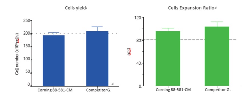 圖 3. 細胞在康寧 88-581-CM 和競爭品牌 G 培養基中無血清培養 14 天增殖能力的比較。