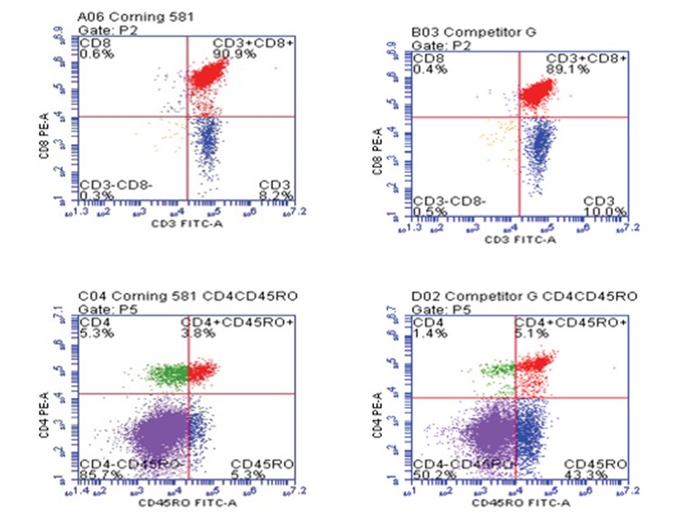圖 4. 細胞在康寧 88-581-CM 培養基和競爭品牌 G 培養基擴增 T 細胞的表型分析。CD3+/CD8+ 為CD8+T 細胞;CD+/CD45RO- 為初始 T 細胞。此外,我們也評估了擴增 2×108 個 T 細胞所需的培養基總成本。康寧 88-581-CM 培養基的成本非常具有優勢。在中國地區,其僅為競爭品牌 G 培養基成本的三分之一。 結論