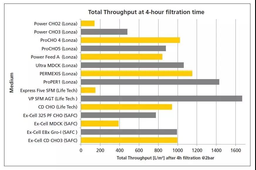 截留性能 表1總結(jié)了使用新型膜進行測試的截留數(shù)據(jù)。膜的病毒截留性能同下游工藝應用中使用的過濾器相當。無包膜細小病毒MVM的截留量超過4個對數(shù)值。分析方法檢測不到濾液中的MVM。可合理預期該膜會截留比細小病毒更大的潛在污染因子。 不同化學限定成分細胞培養(yǎng)基的膜通過量 膜的通過量采用了三個不同供應商的15種培養(yǎng)基來測定。圖2表明了在2bar壓力下,4小時的培養(yǎng)基處理載量因培養(yǎng)基組分不同而差別很大。例如,Lonza Power CHO2相對較快地造成了膜堵塞,而Lonza ProPER1培養(yǎng)基似乎完全不堵膜。 對于一些商業(yè)化細胞培養(yǎng)基,使用串聯(lián)0.1微米過濾器顯著提高了除病毒過濾膜載量(7)。但僅部分培養(yǎng)基可行,有些則沒起作用。諸如泊洛沙姆等保護劑大幅降低了過濾流速(10)。 對于一些商業(yè)化細胞培養(yǎng)基,使用串聯(lián)0.1微米過濾器顯著提高了膜通過量。 降低泊洛沙姆濃度或在添加至培養(yǎng)基以前過濾能大幅提高過濾器的過濾量。業(yè)界應該展開更多研究,從而充分了解不同培養(yǎng)基組分對培養(yǎng)基過濾器過濾性能的影響。根據(jù)本研究,可設(shè)計出一種既能改善過濾性能又不影響后續(xù)細胞培養(yǎng)工藝的培養(yǎng)基。不過,研究表明,在細胞培養(yǎng)基通常的4小時過濾中,開發(fā)的新膜通常過濾載量約1000 L/m²。因此,對于批量制備培養(yǎng)基,這種新膜是經(jīng)濟上可行的辦法,同時也降低了細胞培養(yǎng)基的病毒污染風險。 結(jié)論 在本文中,作者介紹了一種新的病毒截留膜,上游工藝工程師可使用它來過濾化學限定培養(yǎng)基,從而降低風險。此外,作者已經(jīng)證明該方法可截留4個Log以上的非包膜細小病毒。當過濾一系列不同型號的化學限定培養(yǎng)基時,該膜的通量較高,生物制藥公司能夠在上游工藝中使用這種膜,而且不會對工藝成本造成不利的影響。該膜有可能成為基于風險控制來最大程度地降低病毒污染事件的重要環(huán)節(jié),同時提高生物制藥公司的生產(chǎn)能力。 作者簡介 Anika Manzke是病毒清除產(chǎn)品經(jīng)理,Birte Kleindienst是病毒清除產(chǎn)品初級經(jīng)理,二人均供職于Sartorius Stedim Biotech。 參考文獻 1.P. W. Barone, PhD, “Lessons Learned from the Consortium on Adventitious Agent Contamination in Bio Manufacturing,” Viral Safety for Biologics, Cologne, June 21, 2016. 2.V.Bethencourt,Nature Biotechnology 27, 681 (2009),www.nature.com/nbt/journal/v27/n8/full/nbt0809-681a.html 3.O.-W. Merten, Cytotechnology 39, 91–116 (January 9, 2003). 4. M. Moody, PhD, “MMV Contamination–A Case Study: Detection, Root Cause Determination, and Corrective Actions,” PDA/FDA Adventitious Viruses in Biologics: Detection and Mitigation Strategies Workshop, Bethesda, Maryland, Dec. 1-2, 2010. 5. Jim Skrine, “A Biotech Production Facility Contamination Case Study–Minute Mouse Virus,” PDA/FDA Adventitious Viruses in Biologics: Detection and Mitigation Strategies Workshop, Bethesda, Maryland, Dec. 1-2, 2010. 6. Linda Hendricks, “Case Study of Apparent Virus Contamination in Biopharmaceutical Product at Janssen,” PDA/FDA Adventitious Viruses in Biologics: Detection and Mitigation Strategies Workshop, Bethesda, Maryland, Dec. 1-2, 2010. 7.B. Kleindienst, “Proof of Concept–The first virus retentive membrane for risk mitigation in upstream,” Viral Safety & Raw Materials for Biologics, Cologne, June 22nd, 2016. 8.G. Gauvin and R. Nims, PDA Journal, Vol. 64, No 5, 432-435, 2010. 9.B. Hansmann, V. Thom, A. Manzke, “Contamination Risk Mitigation in Cell Culture Media Preparation,” Virus & TSE Safety Forum, Lisabon, June 9-11, 2015. 10.A. Meyer, “Risk Mitigation in Media Preparation—Current Possibilities and Future Trends,” PDA Virus & TSE Safety Forum, Berlin, June 5, 2013. 11.Thomas R. Kreil, “Virus Safety—A Look into the Entire Process Raw Materials, Upstream, Downstream,” European Upstream and Downstream Technology Forum Goettingen, September 8-10, 2014. Corning® KBM 581 淋巴細胞無血清培養(yǎng)基 |