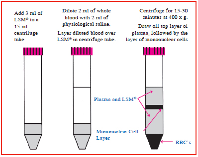 大部分的紅細胞和粒細胞通過梯度遷移形成顆粒狀。由于其密度不同,淋巴細胞和其他單個核細胞(單核細胞和血小板)分布在血漿和LSM兩層中間。淋巴細胞可以通過回抽分層回收,在進一步去除血小板,LSM和血漿。