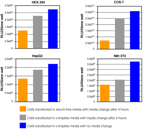 TransIT®-LT1 試劑在含有血清的培養(yǎng)基中表現(xiàn)最佳。使用 TransIT®-LT1 試劑,使用三種不同培養(yǎng)基條件用熒光素酶表達載體轉(zhuǎn)染指定的細胞系:在 (1) 無血清培養(yǎng)基存在下轉(zhuǎn)染細胞或 (2) 培養(yǎng)基更換 4 小時的完全培養(yǎng)基轉(zhuǎn)染后,或在 (3) 完全培養(yǎng)基存在下轉(zhuǎn)染,轉(zhuǎn)染后沒有培養(yǎng)基更換。轉(zhuǎn)染 48 小時后收集細胞,測定每孔熒光素酶的總活性。