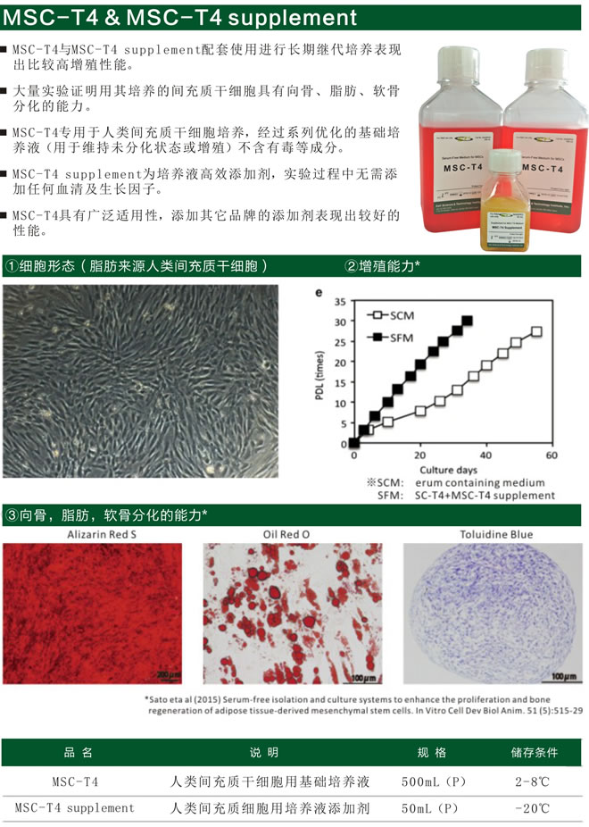 【產(chǎn)品名稱】間充質(zhì)干細(xì)胞無血清培養(yǎng)基 【產(chǎn)品概述】MSC-T4 無血清培養(yǎng)基是專為間充質(zhì)干細(xì)胞研究而開發(fā)的基礎(chǔ)培養(yǎng)基,不含有任何動物蛋白質(zhì)成分,含有重組或醫(yī)療級人類蛋白質(zhì)的無血清細(xì)胞培養(yǎng)基,滿足人類間充質(zhì)干細(xì)胞體外長期傳代及增殖培養(yǎng);增殖培養(yǎng)后的細(xì)胞具有分化為骨,軟骨和脂肪等組織的能力。 【產(chǎn)品用途】適用于人間充質(zhì)干細(xì)胞體外增殖培養(yǎng),僅供科研使用。 【產(chǎn)品規(guī)格】500ml/瓶 【使用方法】