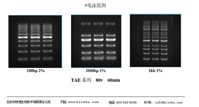5. 兼容:瓊脂糖預染預制膠為 TAE 體系,與實驗室常規自制的 TAE 瓊脂糖膠完全一致,使用完美銜接,您只需要用您之前的TAE 電壓電泳即可。