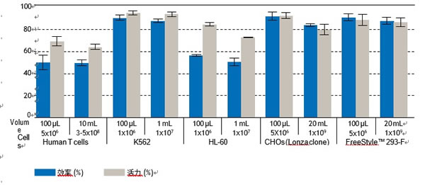 各種代表性的細胞類型,在相同條件下轉化同一種pmaxGFP載體質粒,小體積(100 μL Nucleocuvette™轉染杯)與大體積(1mL或LV Nucleocuvette™ 電轉盒)的轉染情況比較。